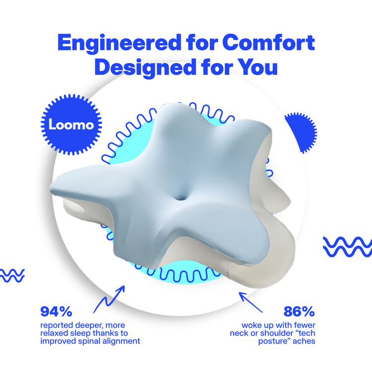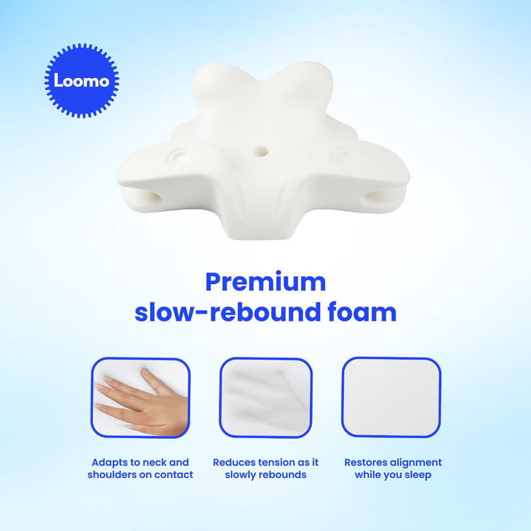 The Loomo Relief Pillow is uniquely designed to provide optimal support and comfort, specifically targeting relief for cervical pain and neck stiffness. Its ergonomic contouring and memory foam construction offer personalized support by conforming to the natural curvature of the neck and head.